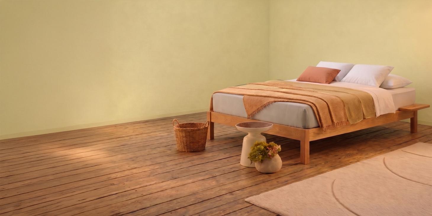 low wooden platform bed without headboard